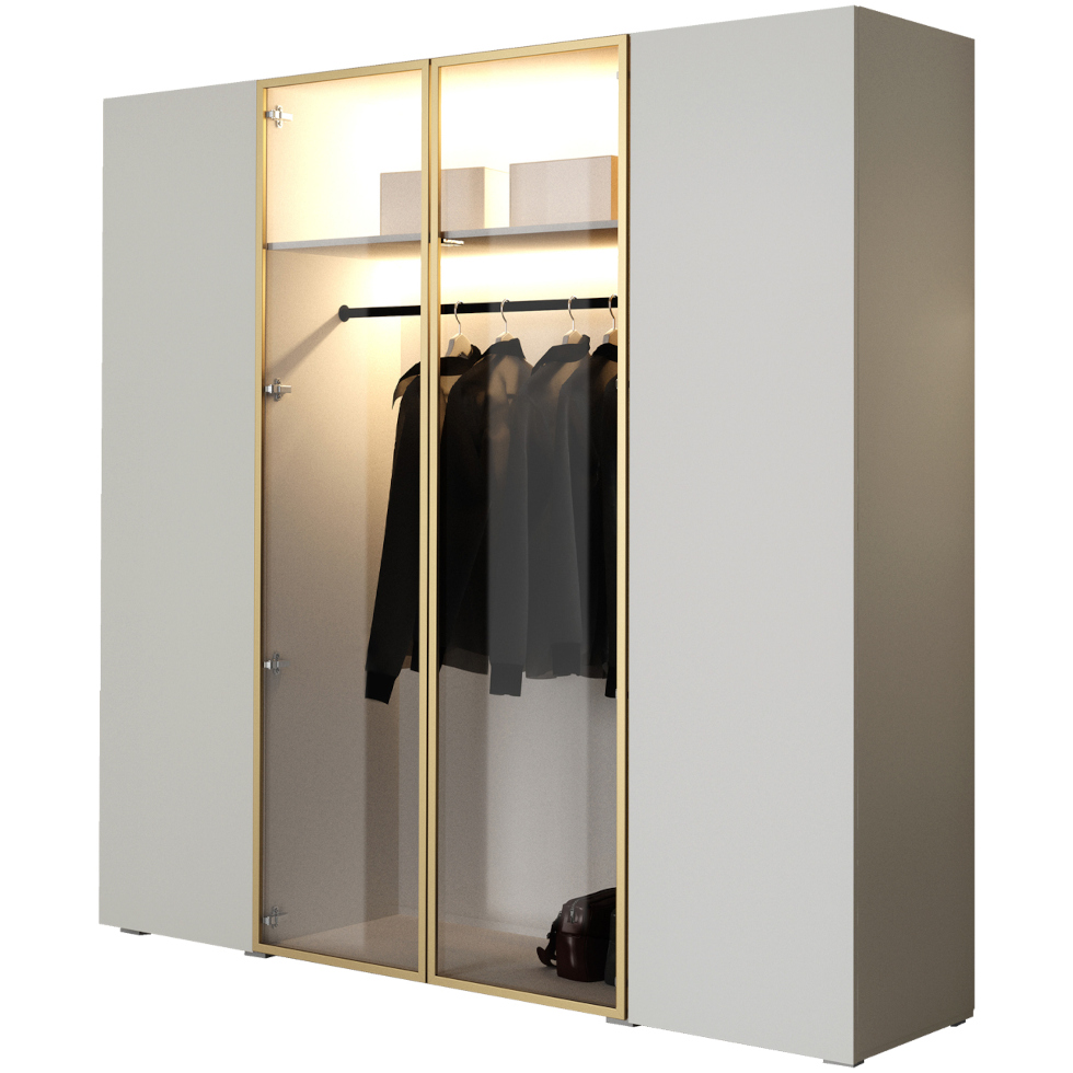 Wolisz nowoczesne meble z zacięciem glamour? Nietuzinkowa szafa ACATI to kwintesencja elegancji. Wspaniale będzie się prezentować w ekskluzywnym apartamencie. Przeszklone drzwi w złotej ramie wyglądają niezwykle wytwornie, a jednocześnie subtelnie. Świetnie współgrają z modnym w tym sezonie odcieniem kaszmiru. Mebel posiada drążek na ubrania oraz półki o głębokości 50 cm. Przeszklone wnętrze warto zaopatrzyć w oświetlenie ledowe, które wyeksponuje zawartość, a jednocześnie wprowadzi do aranżacji przyjemny nastrój. Idealnym dopełnieniem tego modelu jest nadstawka ACATI dostępna w dwóch wariantach – z przeszklonymi lub pełnymi frontami. Ją również można wyposażyć w energooszczędne ledy. Całość wykonano z mocnej płyty meblowej laminowanej, płyty MDF lakierowanej oraz szkła hartowanego. Przy drzwiach zamontowano system push to open.