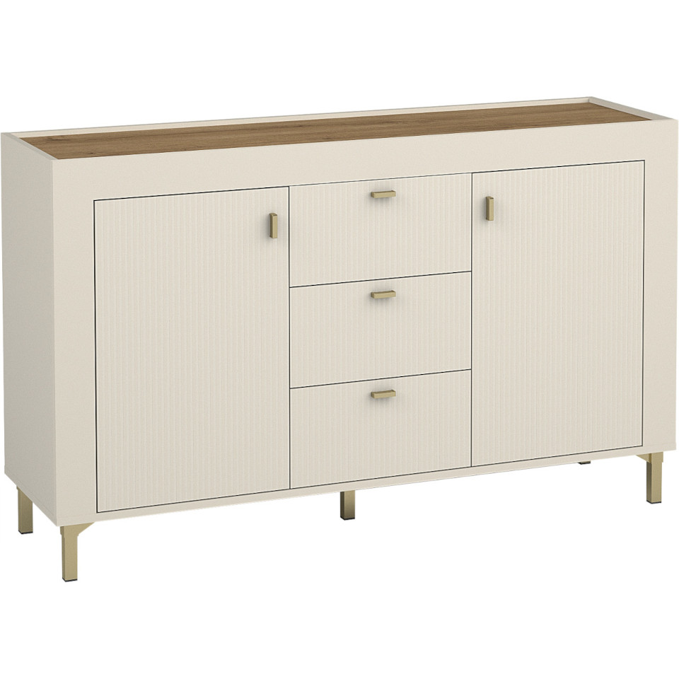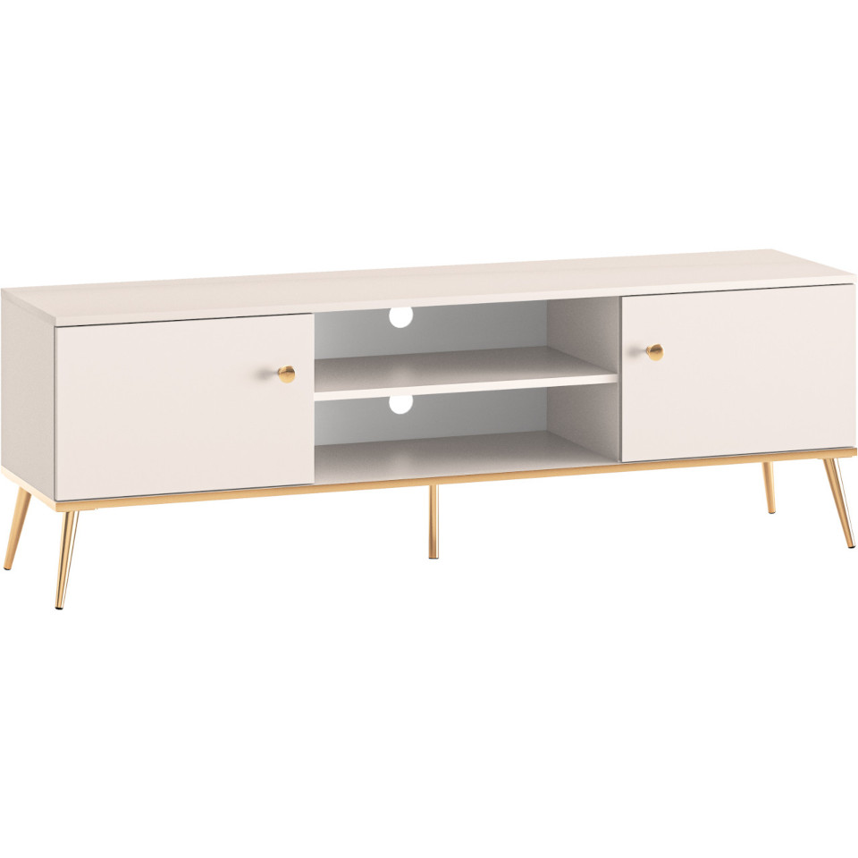 Najlepszym wyborem do eleganckiej aranżacji z odrobiną blichtru jest duet kaszmir+złote akcenty. Przykładem może być tutaj kaszmirowa komoda RTV LESGIN 05, zaopatrzona w złote nóżki oraz biżuteryjne uchwyty. Mebel posiada funkcję cichego domyku. Idealna propozycja do kącika telewizyjnego w salonie.