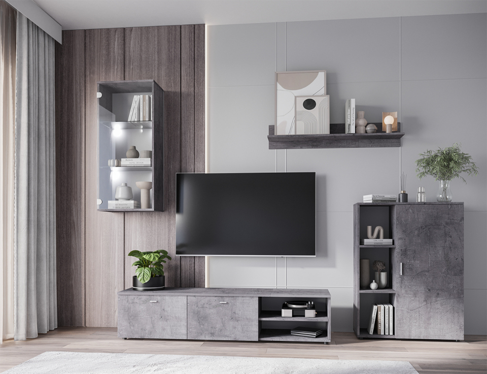 Jedną z propozycji naszego sklepu jest nowoczesna sofa LUCI o kompaktowych wymiarach, która idealnie sprawdzi się w kawalerce, małym salonie lub pokoju młodzieżowym. Mebel posiada funkcję spania oraz wygodną poduchę oparciową ozdobioną podłużnymi przeszyciami. Ta mini kanapa znakomicie będzie wyglądać w towarzystwie mebli DOMI w kolorze betonu. W skład zestawu wchodzi witryna wisząca ze szkłem, półka ścienna, komoda stojąca oraz szafka RTV. Szklane półki można zaopatrzyć w subtelne oświetlenie ledowe, które wprowadzi do wnętrza przytulny nastrój.
