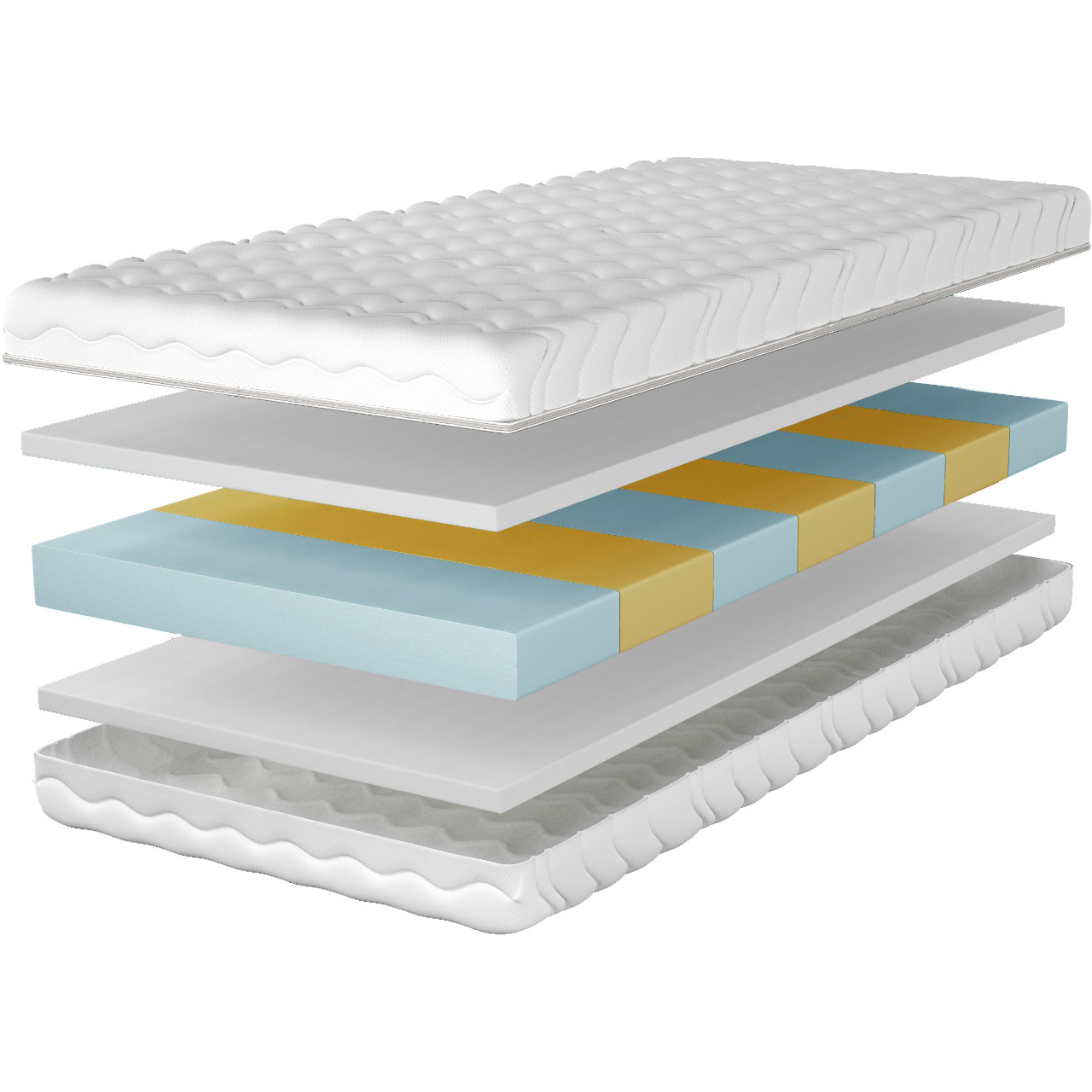 Wnętrze materaca FEBUS składa się z wkładu wykonanego z pianki, która została podzielona na 7 stref twardości. Każda ze stref ma specyficzną twardość, dostosowaną do różnych obszarów ciała.