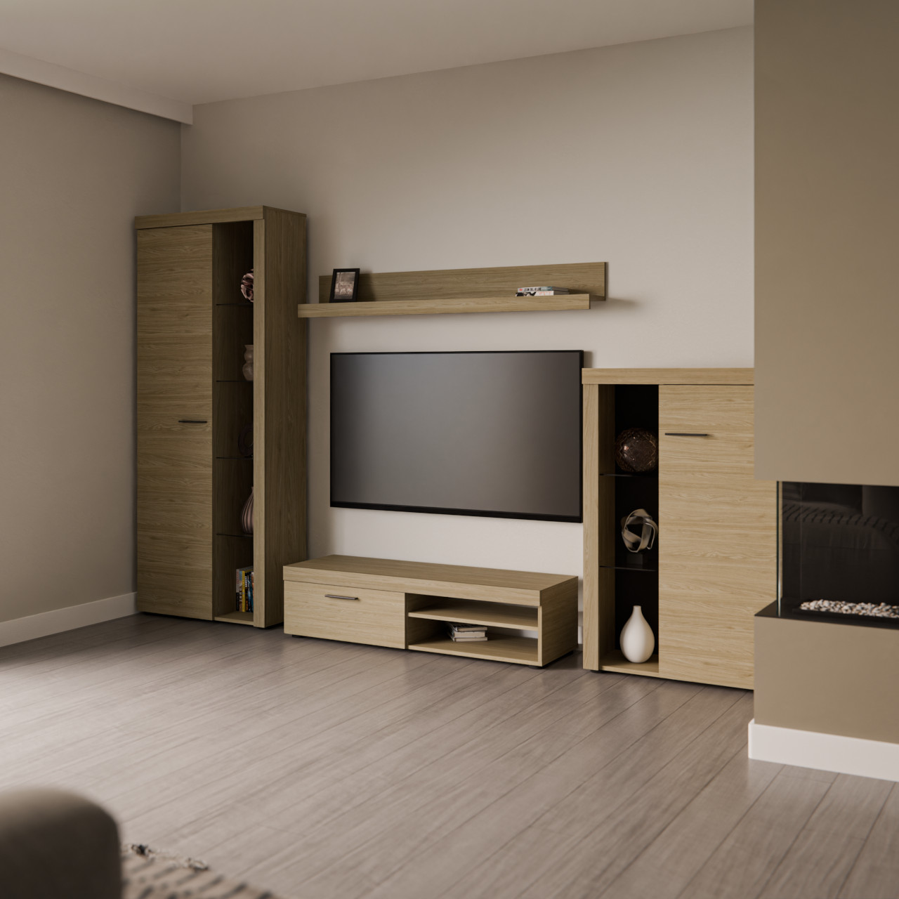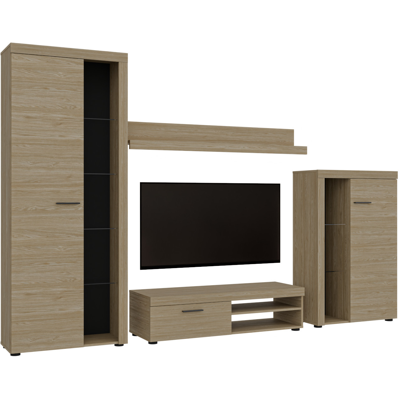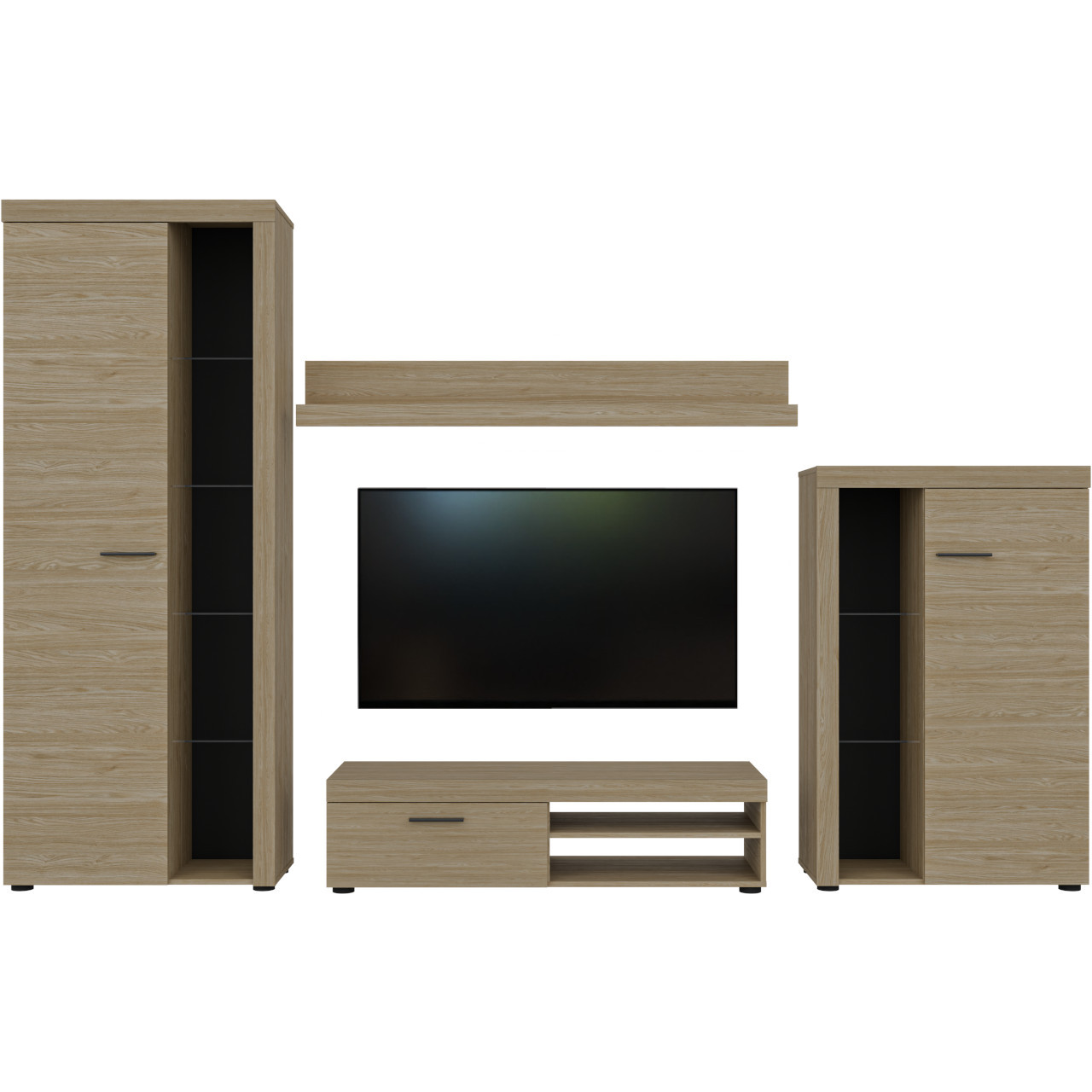 Witryna wysoka (75/190/33,8) Komoda RTV (120/31,5/40,3) Półka wisząca (140/20,5/19,5) Witryna niska (75/117/33,8) |