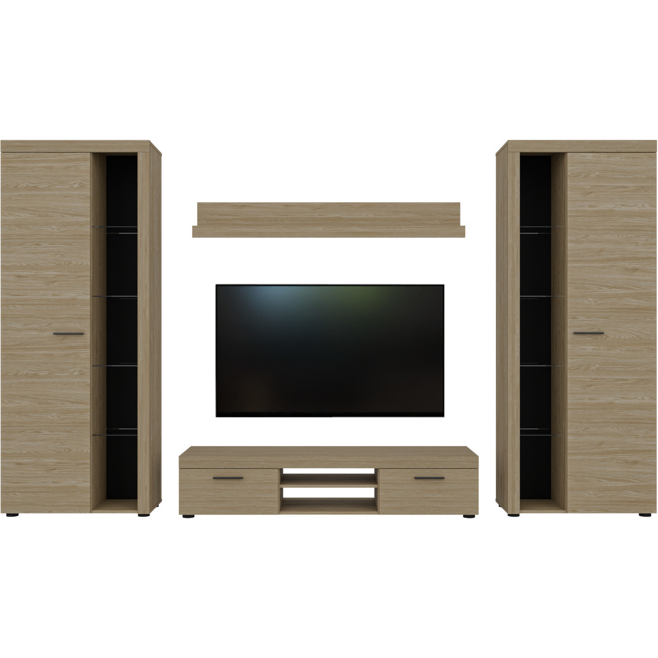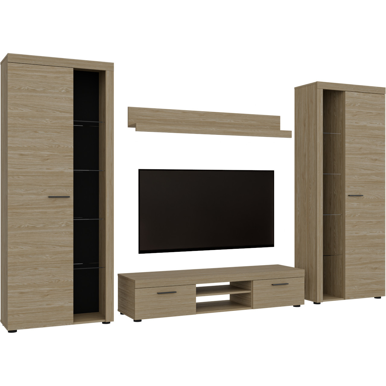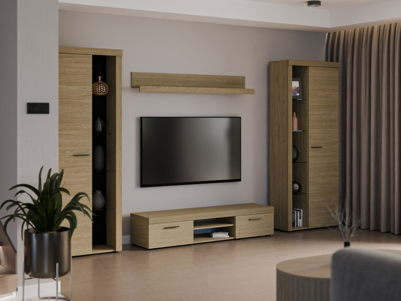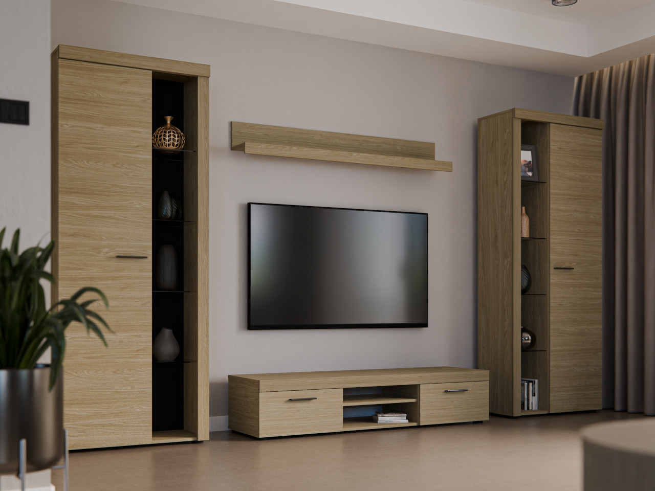 Witryna wysoka lewa (75/190/33,8) Witryna wysoka prawa (75/190/33,8) Komoda RTV (150/31,5/40,3) Półka wisząca (140/20,5/19,5) |