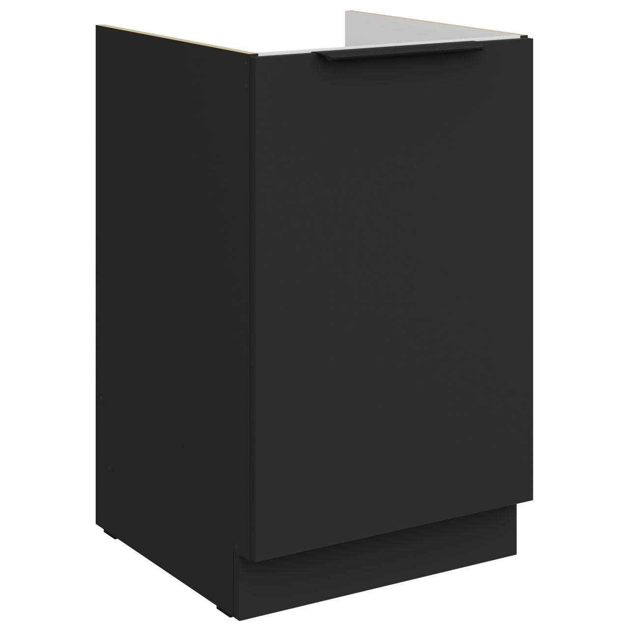 Szafka dolna pod zlew. Szafka posiada jeden front. Wnętrze szafki w kolorze białym. Otwory na uchwyt wiercone nieprzelotowo. |