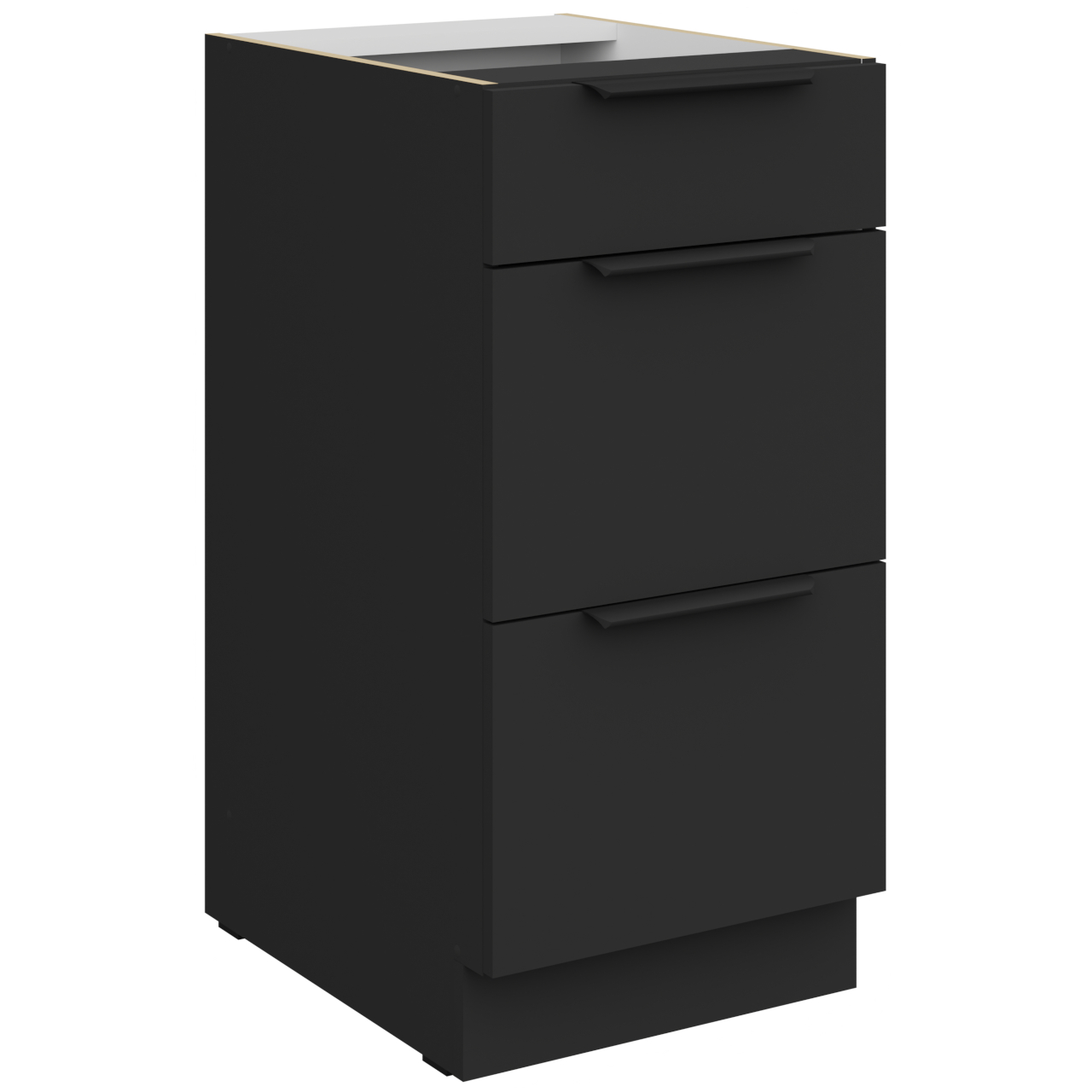 Wnętrze szafki w kolorze białym. Dno szuflady o grubości 16mm w kolorze szarym. Boki szuflady metalowe. Otwory na uchwyt wiercone nieprzelotowo. |