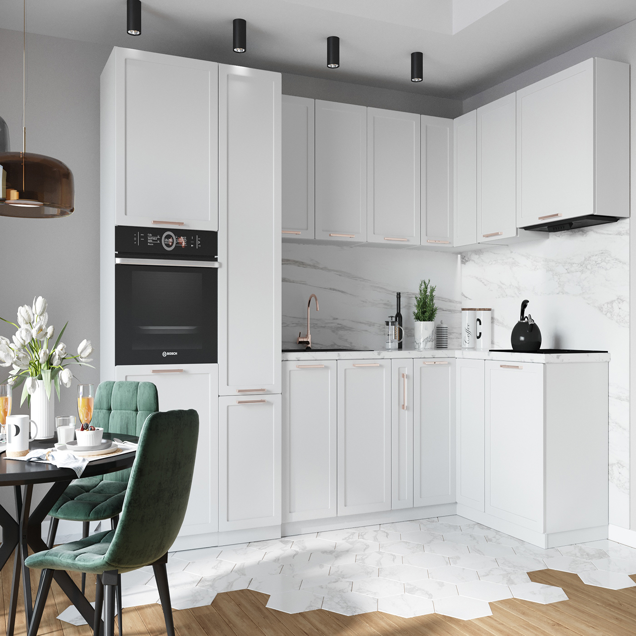 Jasne fronty w macie lub na wysoki połysk znakomicie sprawdzą się w każdym wnętrzu. Biel stwarza ogrom możliwości wnętrzarskich – łączy się z dowolną kolorystyką, łatwo wprowadzić ją do wystroju kuchni lub aneksu kuchennego otwartego na salon. Do białych mebli pasują różne elementy wykończeniowe, w tym te wykonane z drewna, metalu, szkła, kamienia. Szukasz gotowej recepty na modne wnętrze kuchni? Postaw na białe szafki i dorzuć stylowe dodatki, które podkreślą oryginalny charakter pomieszczenia.
