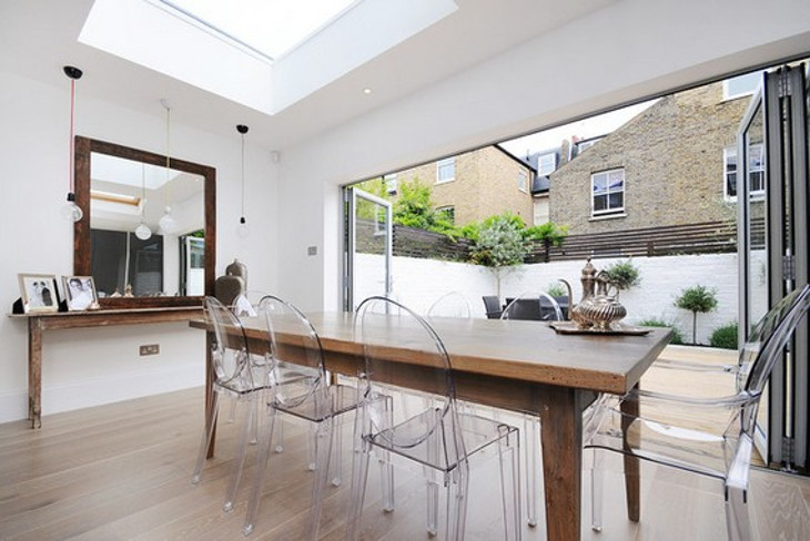 Transparentne krzesła doskonale sprawdzają się przede wszystkim w jadalni. Stanowią idealne towarzystwo dla dużych, drewnianych stołów, ponieważ nie przytłaczają ich, pozwalają im błyszczeć i podkreślają ich priorytetowy charakter. Istotną zaletą akrylowych krzeseł jest też łatwość utrzymania ich w czystości - to duży plus w miejscu szczególnie podatnym na przypadkowe zaplamienia.