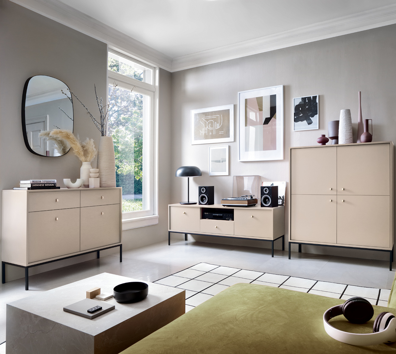 Cechą charakterystyczną mebli pokojowych NUBIA są frezowane fronty oraz proste, geometryczne kształty szafek usadowionych na wysokich metalowych nóżkach. Poszczególne elementy są niezwykle ustawne, co pozwala łatwo zaaranżować niemal każdą przestrzeń. W skład zestawu wchodzą dwie komody (w tym jedna pod telewizor), dwa regały oraz ława kawowa z półkami pod blatem. Elegancką czerń zestawiono z nóżkami i uchwytami w odcieniu złotego beżu. Meble fantastycznie będą się prezentować w salonie zainspirowanym stylem modern classic. Szafki posiadają system push to open i oferują sporo miejsca do przechowywania. Zestaw NUBIA dostępny jest także w subtelnym kolorze kaszmiru.