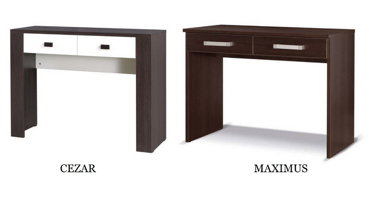 Estetyczny, uniwersalny design biurek CEZAR i MAXIMUS sprawia, że mogą one również pełnić funkcję damskiej toaletki. Obydwa biurka można skompletować z zestawem mebli do sypialni z tych samych serii. Obszerne szuflady zapewniają mnóstwo miejsca zarówno na dokumenty i akcesoria biurowe, jak i na przybory do makijażu i biżuterię.