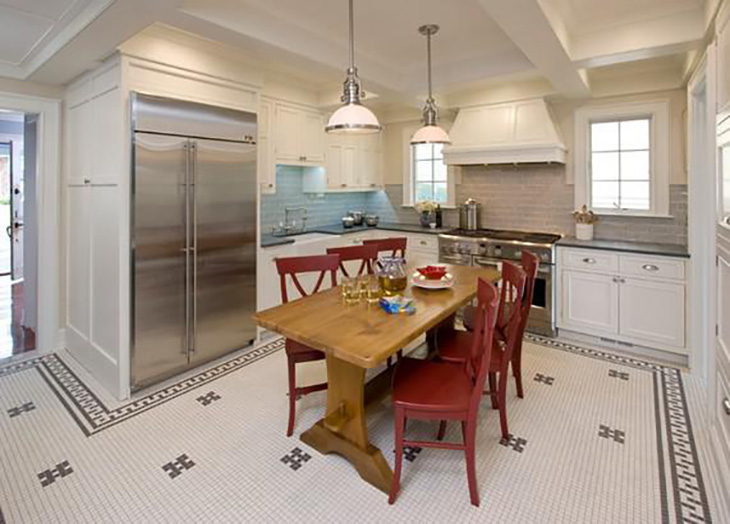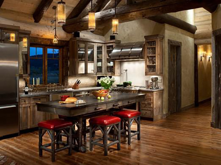 Kolejny przykład na to, że czerwień jest stworzona do wnętrz o charakterze rustykalnym. W tym przypadku rozświetla dominujące w pomieszczeniu głębokie brązy i służy jako przeciwwaga dla zimnych, masywnych sprzętów ze stali nierdzewnej.