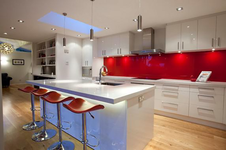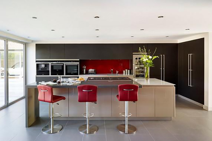 Nowoczesna minimalistyczna i monochromatyczna kuchnia z wyspą aż prosi się o mocny akcent kolorystyczny. W tym przypadku odważny panel i czerwone hokery na metalowej podstawie tworzą duet doskonały.